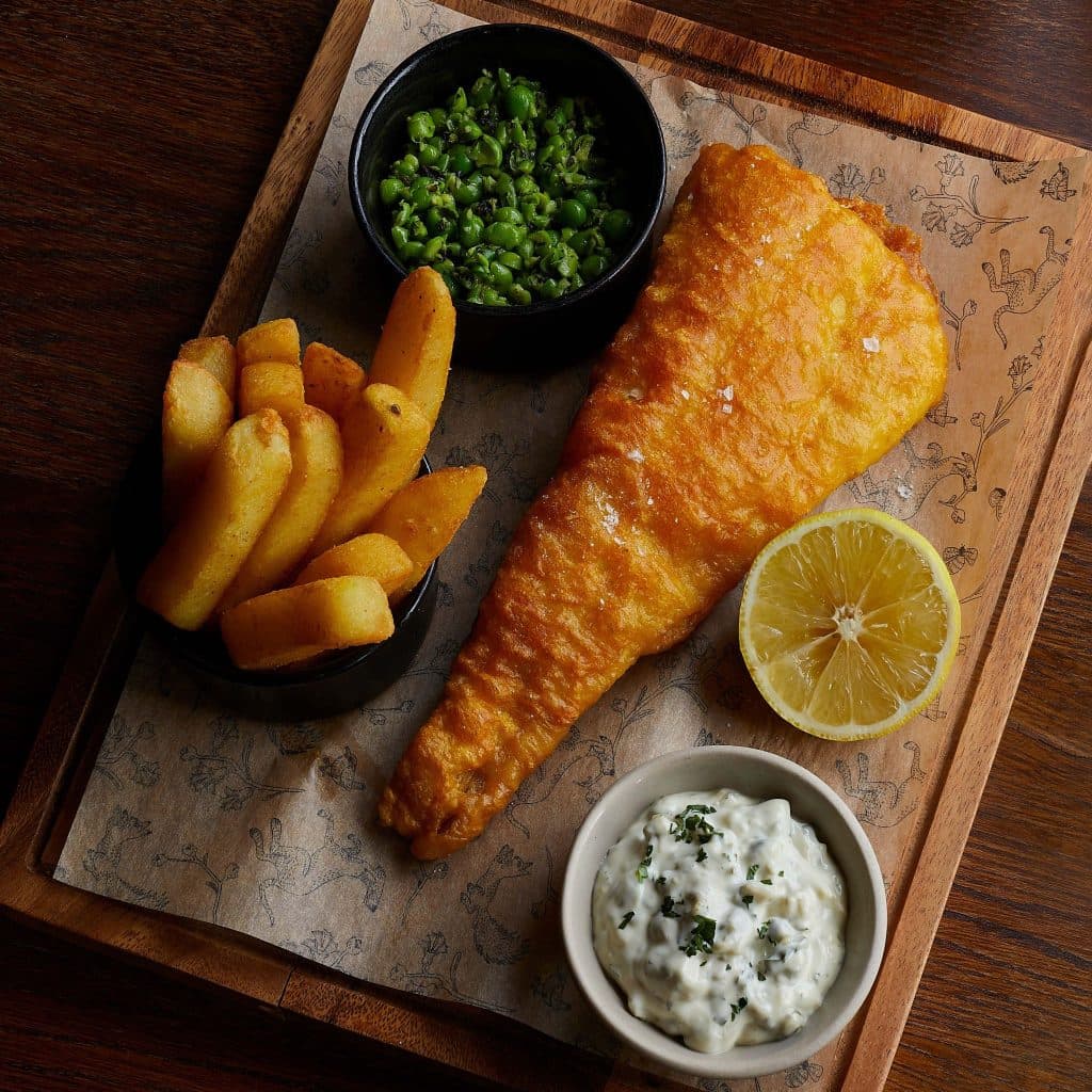 Our beer-battered haddock is golden, crisp and cooked with care, served with crushed minted peas, chips and tartare sauce.